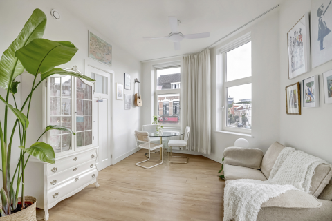 De ruime woonkamer is dankzij de vele ramen lekker licht en heeft toegang tot het zonnige, eigen terras. De half open keuken is voorzien van een 4-pits gaskookplaat, een rvs afzuigkap, een koelkast met vriesruimte en voldoende kastruimte.